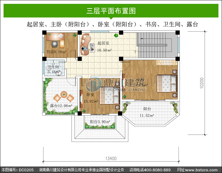 | 三 層: | 起居室、主臥(附陽臺)、臥室(附陽臺)、書房、衛生間、露臺 | |||
