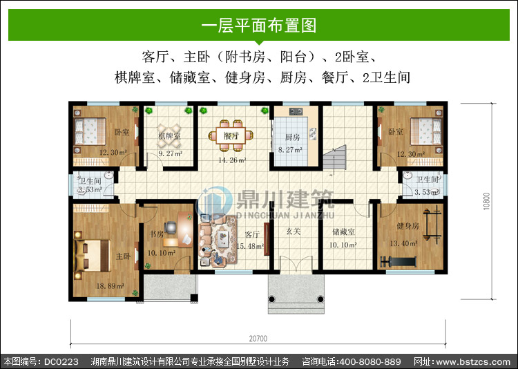 | 一 層: | 客廳、主臥(附書房、陽臺)、2臥室、棋牌室、儲藏室、健身房、廚房、餐廳、2衛生間 | |||