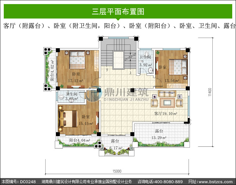 | 三 層: | 客廳(附露臺)、臥室(附衛生間,陽臺)、臥室(附陽臺)、臥室、衛生間、露臺 | |||