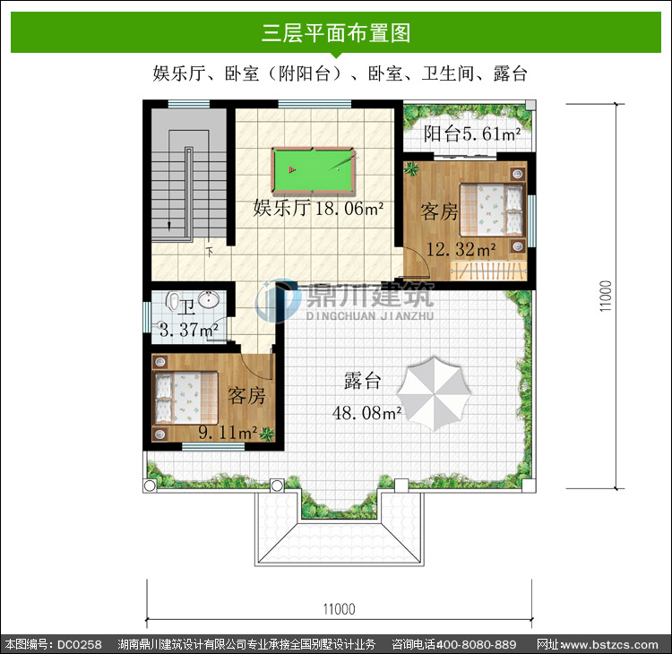 | 三 層: | 娛樂廳、臥室(附陽臺)、臥室、衛生間、露臺 | |||