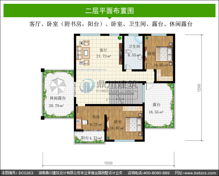 | 二 層: | 客廳、臥室(附書房,陽(yáng)臺(tái))、臥室、衛(wèi)生間、露臺(tái)、休閑露臺(tái) | |||