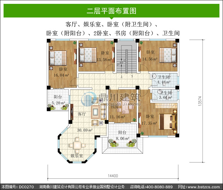 | 二 層: | 客廳、娛樂室、臥室(附衛生間)、臥室(附陽臺)、2臥室、書房(附陽臺)、衛生間 | |||