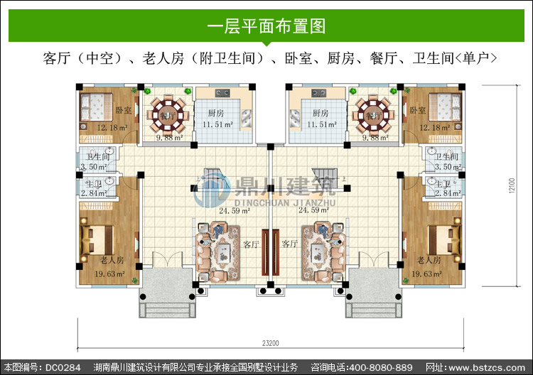 | 一 層: | 客廳(中空)、老人房(附衛生間)、臥室、廚房、餐廳、衛生間 | |||