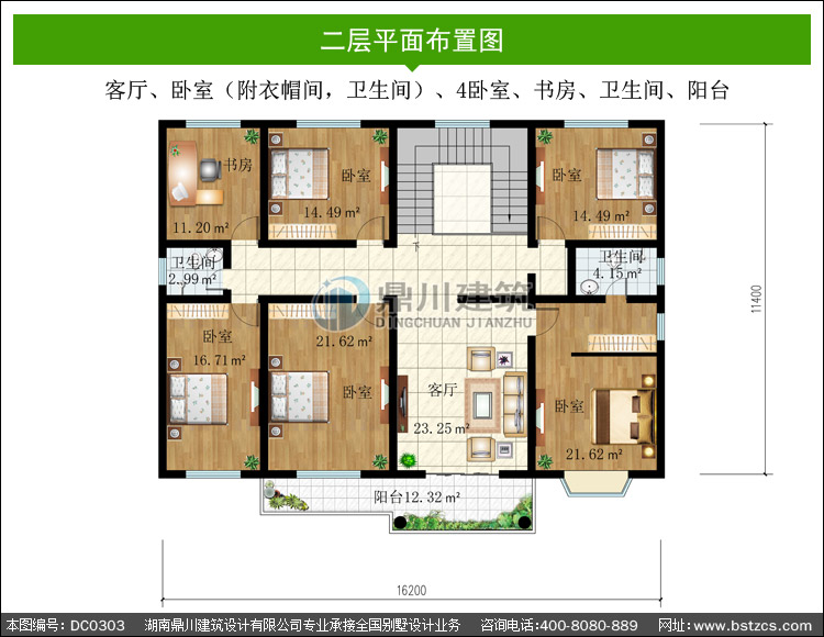 | 二 層: | 客廳(附陽臺)、臥室(附衣帽間,衛生間)、4臥室、書房、衛生間 | |||