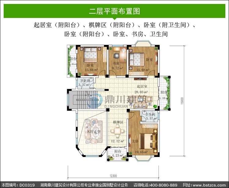 | 二 層: | 起居室(附陽臺)、棋牌區(附陽臺)、臥室(附衛生間)、臥室(附陽臺)、臥室、書房、衛生間 | |||