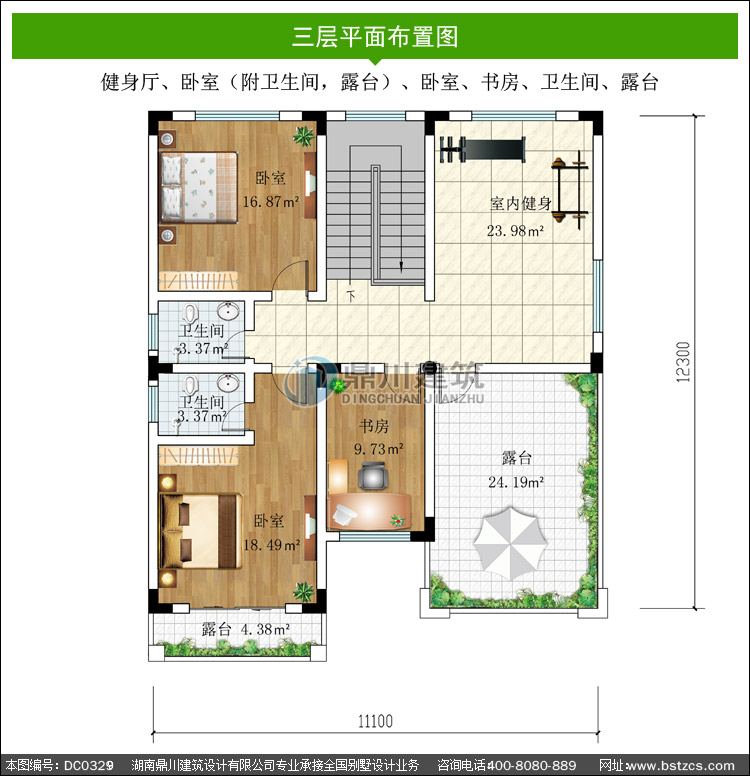 | 三 層: | 健身廳、臥室(附衛生間,露臺)、臥室、書房、衛生間、露臺 | |||