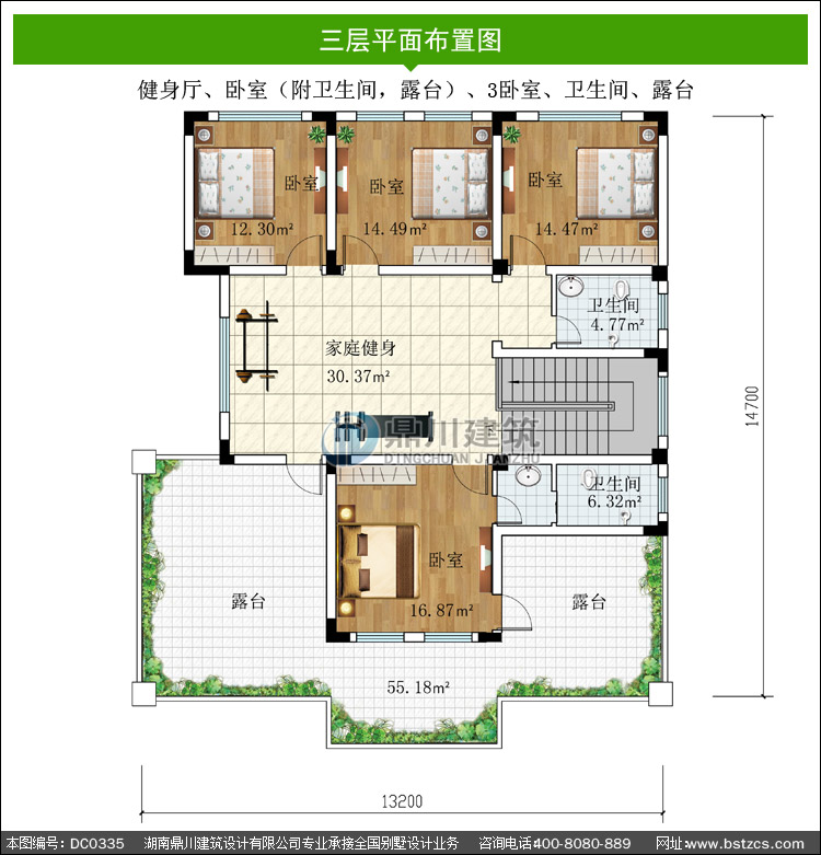 | 三 層: | 健身廳、臥室(附衛生間,露臺)、3臥室、衛生間、露臺 | |||