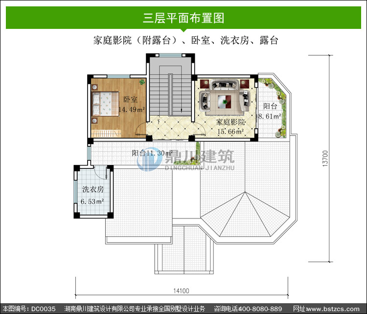 | 三 層: | 家庭影院(附露臺(tái))、臥室、洗衣房、露臺(tái) | |||