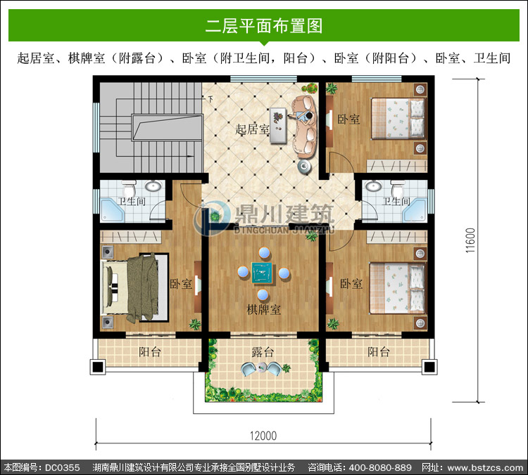 | 二 層: | 起居室、棋牌室(附露臺)、臥室(附衛(wèi)生間,陽臺)、臥室(附陽臺)、臥室、衛(wèi)生間 | |||