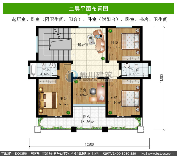| 二 層: | 起居室、臥室(附衛生間,陽臺)、臥室(附陽臺)、臥室、書房、衛生間 | |||