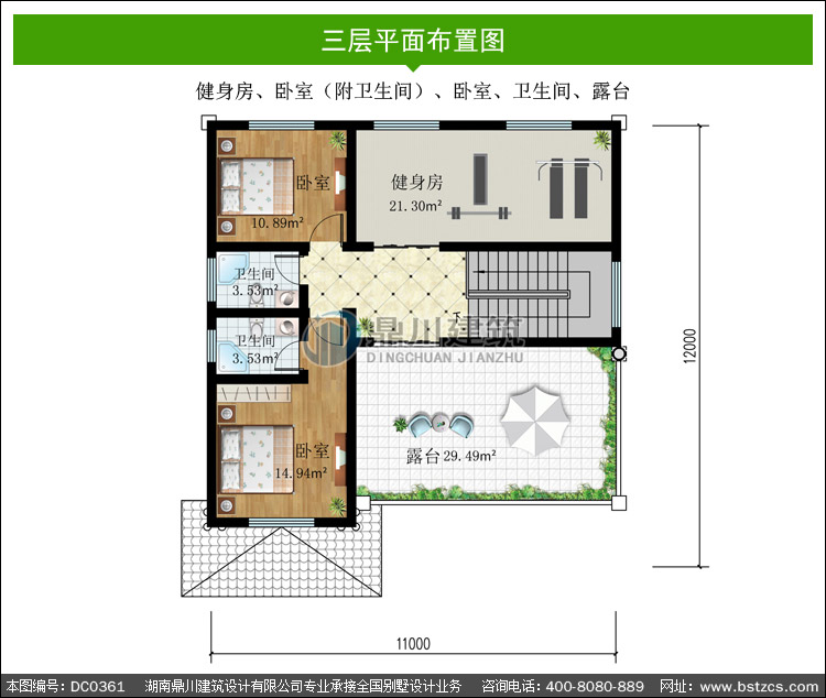 | 三 層: | 健身房、臥室(附衛生間)、臥室、衛生間、露臺 | |||