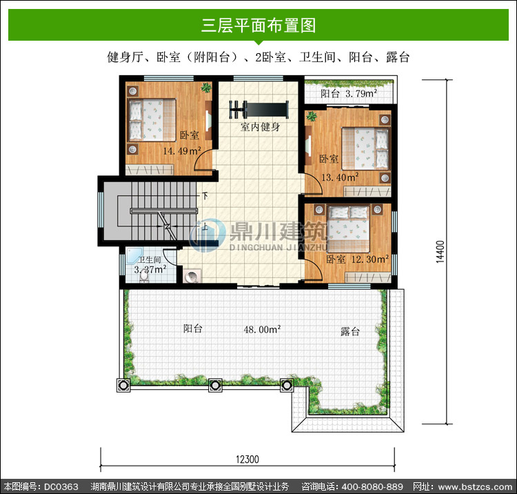 | 三 層: | 健身廳、臥室(附陽臺)、2臥室、衛生間、陽臺、露臺 | |||