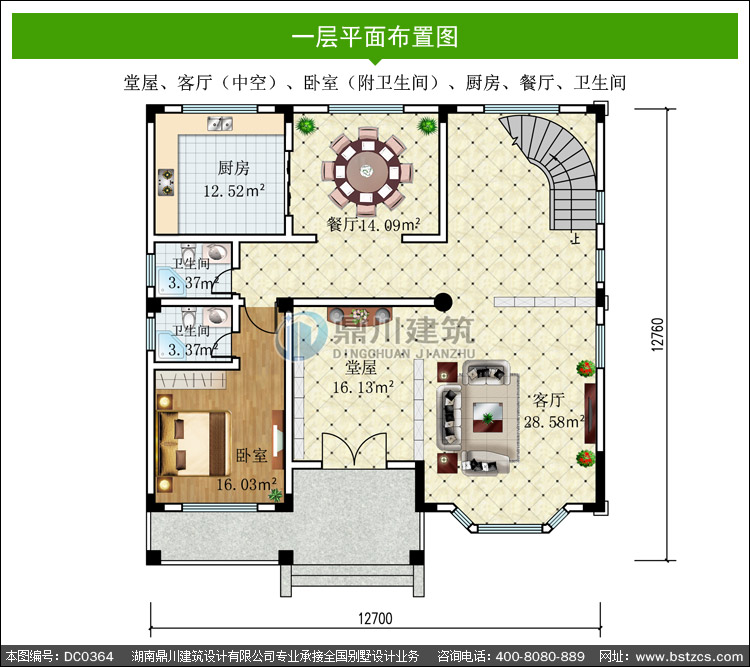 | 一 層: | 堂屋、客廳(中空)、臥室(附衛生間)、廚房、餐廳、衛生間 | |||