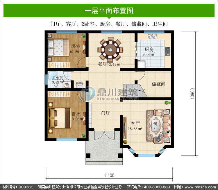 | 一 層: | 門廳、客廳、2臥室、廚房、餐廳、儲藏間、衛生間 | |||