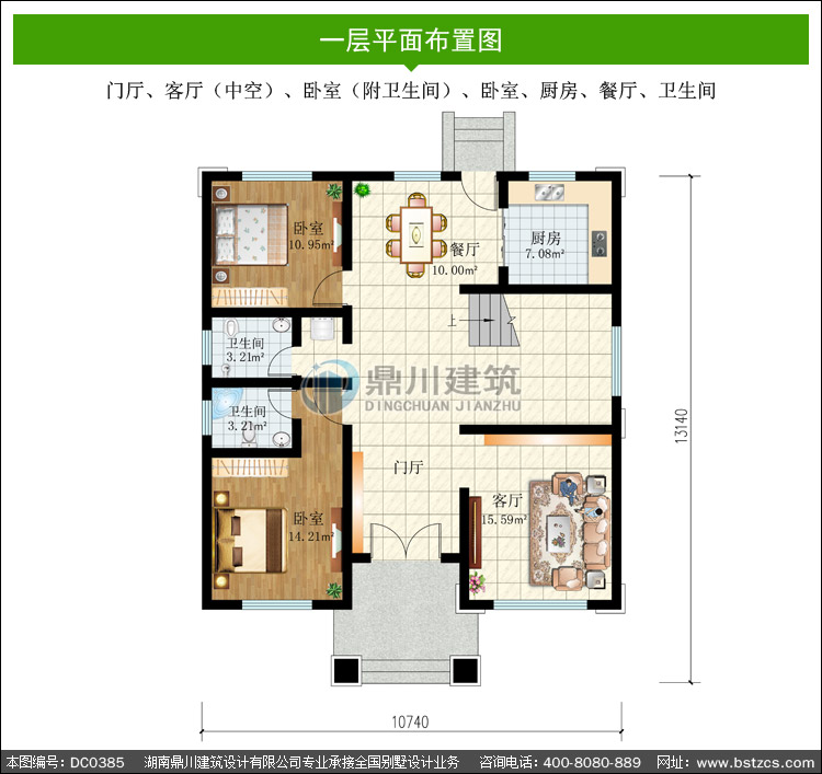 | 一 層: | 門廳、客廳(中空)、臥室(附衛生間)、臥室、廚房、餐廳、衛生間 | |||