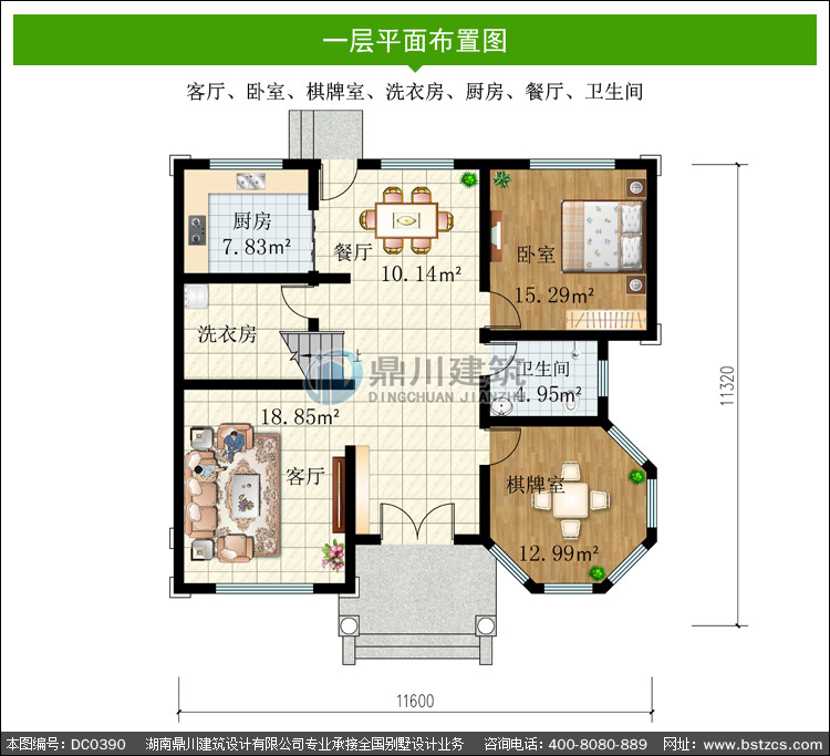 | 一 層: | 客廳、臥室、棋牌室、洗衣房、廚房、餐廳、衛(wèi)生間 | |||