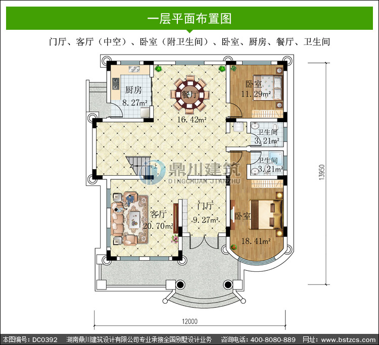 | 一 層: | 門廳、客廳(中空)、臥室(附衛生間)、臥室、廚房、餐廳、衛生間 | |||