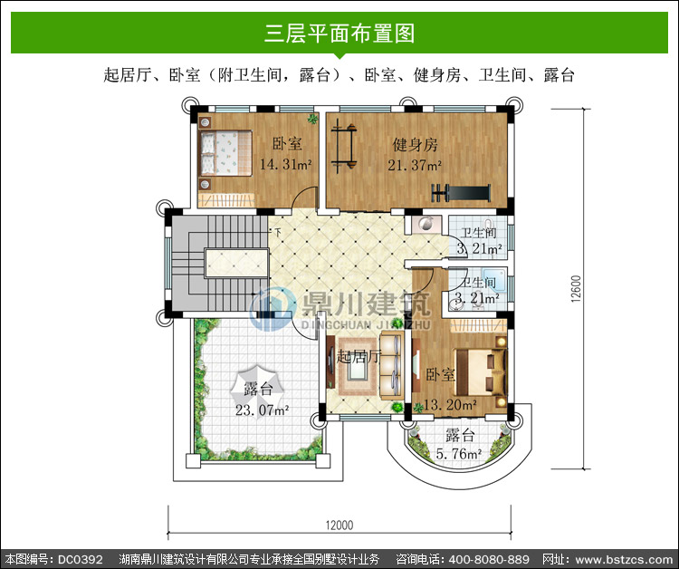 | 三 層: | 起居廳、臥室(附衛生間,露臺)、臥室、健身房、衛生間、露臺 | |||