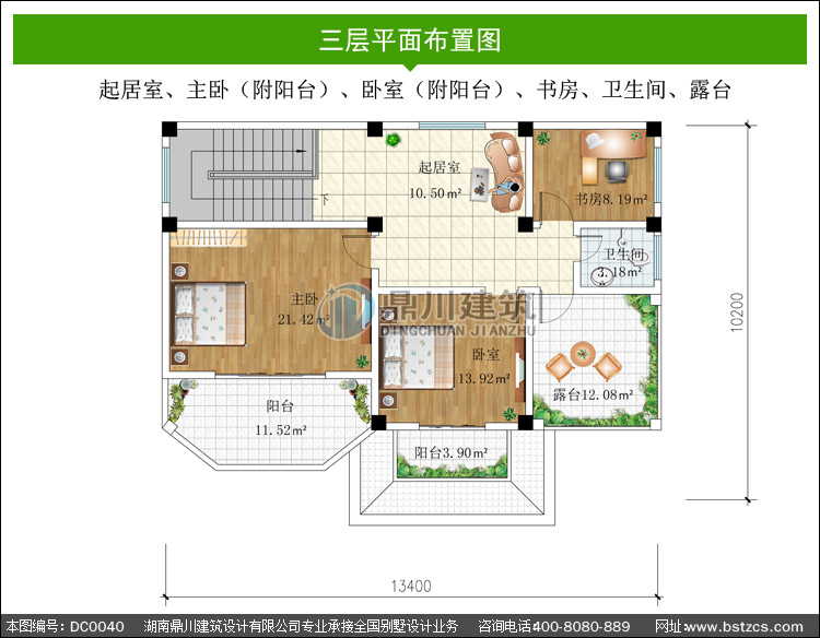 | 三 層: | 起居室、主臥(附陽臺(tái))、臥室(附陽臺(tái))、書房、衛(wèi)生間、露臺(tái) | |||