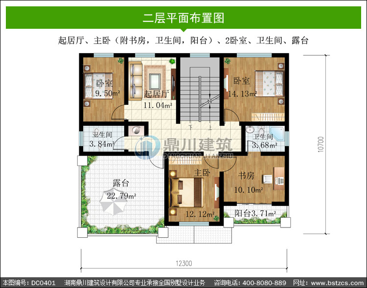 | 二 層: | 起居廳、主臥(附書房,衛生間,陽臺)、2臥室、衛生間、露臺 | |||