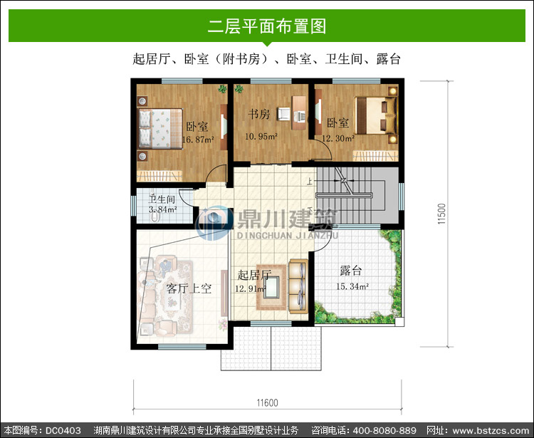 | 二 層: | 起居廳、臥室(附書房)、臥室、衛(wèi)生間、露臺 | |||