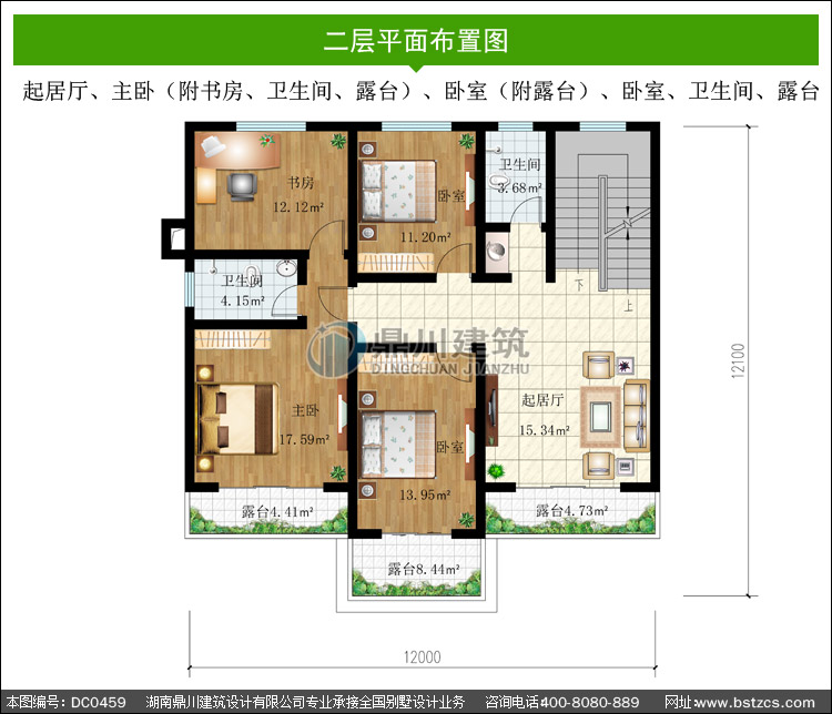 | 二 層: | 起居廳、主臥(附書房、衛(wèi)生間、露臺)、臥室(附露臺)、臥室、衛(wèi)生間、露臺 | |||