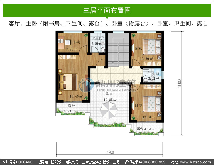 | 三 層: | 客廳、主臥(附書房、衛(wèi)生間、露臺(tái))、臥室(附露臺(tái))、臥室、衛(wèi)生間、露臺(tái) | |||