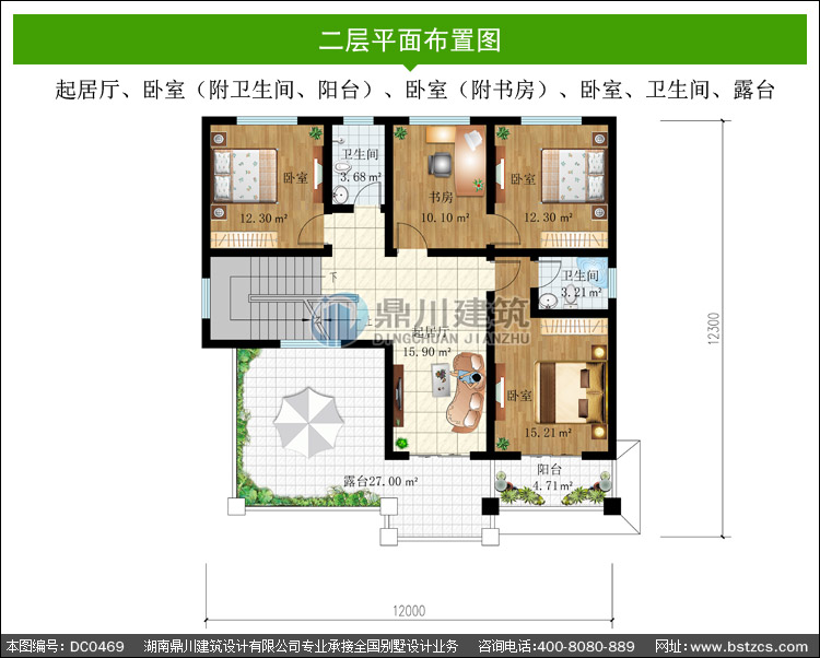 | 二 層: | 起居廳、臥室(附衛生間、陽臺)、臥室(附書房)、臥室、衛生間、露臺 | |||