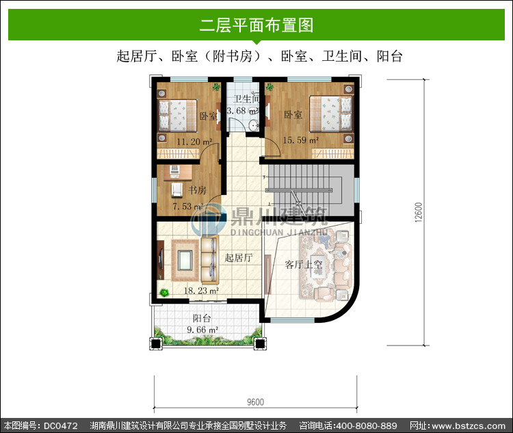 | 二 層: | 起居廳、臥室(附書房)、臥室、衛(wèi)生間、陽臺 | |||