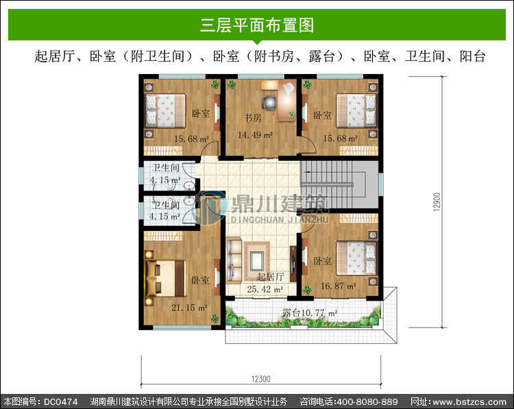 | 三 層: | 起居廳、臥室(附衛生間)、臥室(附書房)、2臥室、衛生間、露臺 | |||