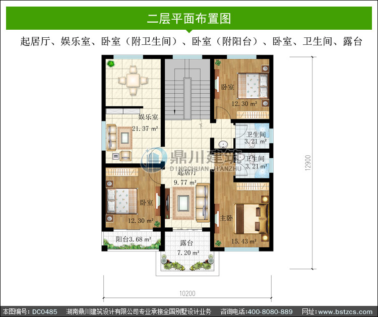 | 二 層: | 起居廳、娛樂室、臥室(附衛生間)、臥室(附陽臺)、臥室、衛生間、露臺 | |||
