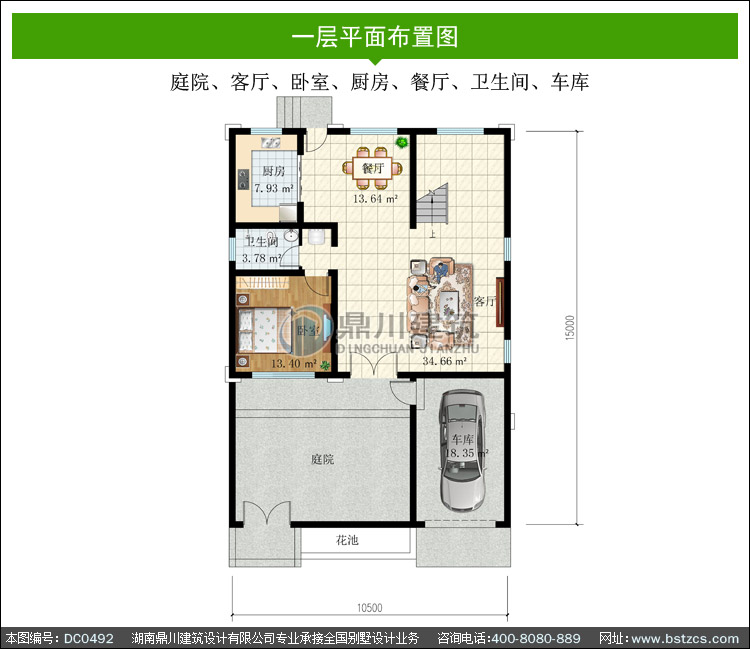 | 一 層: | 庭院、客廳、臥室、廚房、餐廳、衛(wèi)生間、車庫 | |||