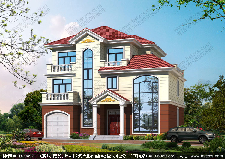 復式三層帶車庫歐式別墅外觀效果圖及施工圖設計_農村三層別墅設