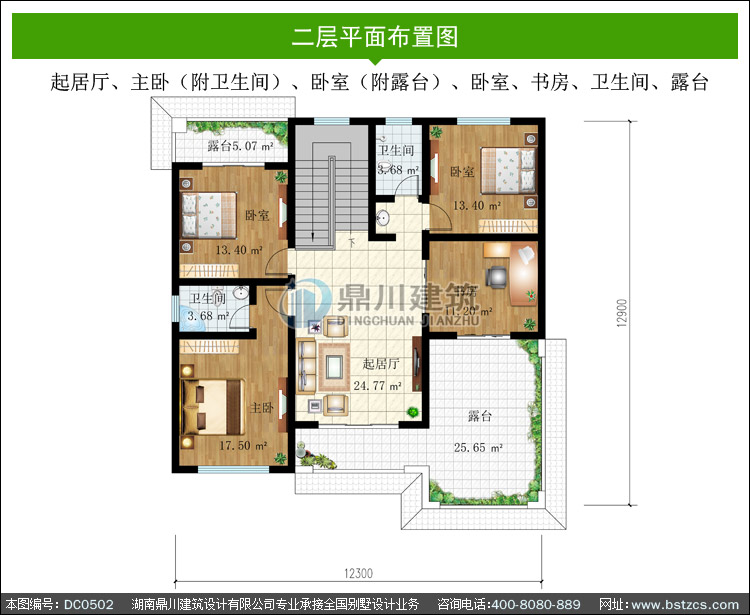 | 二 層: | 起居廳、主臥(附衛生間)、臥室(附露臺)、臥室、書房、衛生間、露臺 | |||