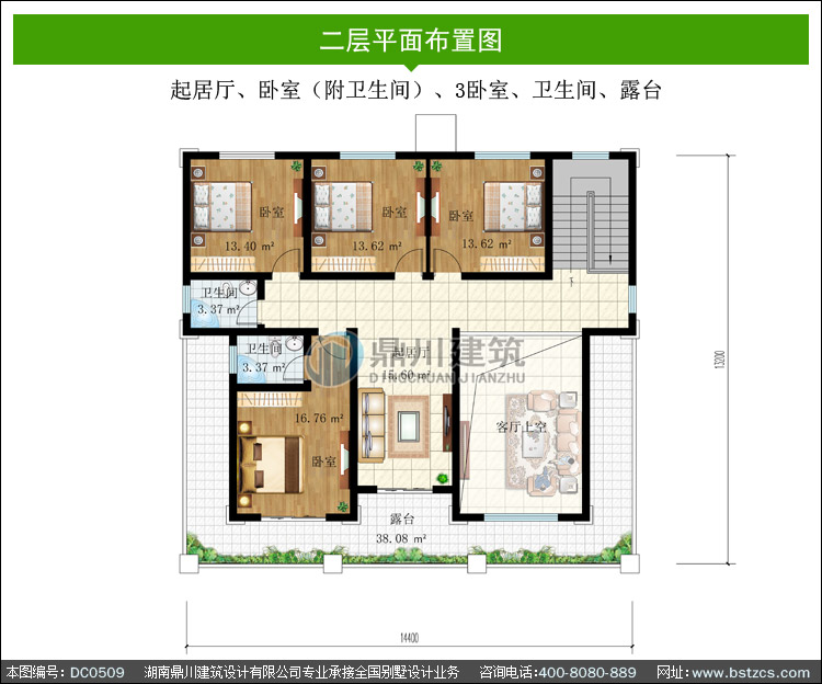 | 二 層: | 起居廳、臥室(附衛(wèi)生間)、3臥室、衛(wèi)生間、露臺 | |||