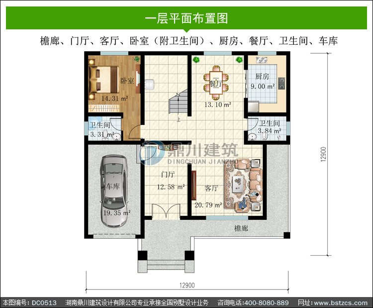| 一 層: | 檐廊、門廳、客廳、臥室(附衛生間)、廚房、餐廳、衛生間、車庫 | |||