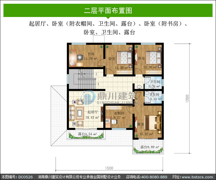 | 二 層: | 起居廳、臥室(附衣帽間、衛生間、露臺)、臥室(附書房)、臥室、衛生 間、露臺 | |||