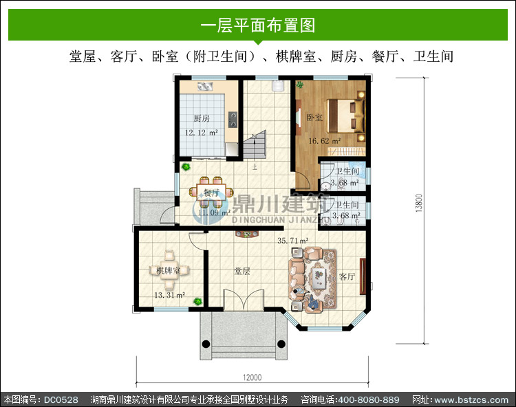 | 一 層: | 堂屋、客廳、臥室(附衛生間)、棋牌室、廚房、餐廳、衛生間 | |||