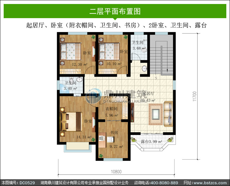 | 二 層: | 起居廳、臥室(附衣帽間、衛生間、書房)、2臥室、衛生間、露臺 | |||