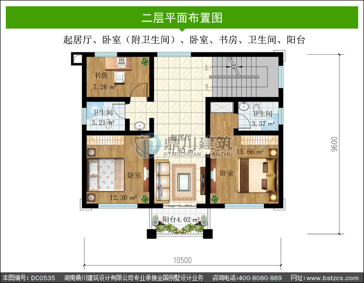 | 二 層: | 起居廳、臥室(附衛生間)、臥室、書房、衛生間、陽臺 | |||