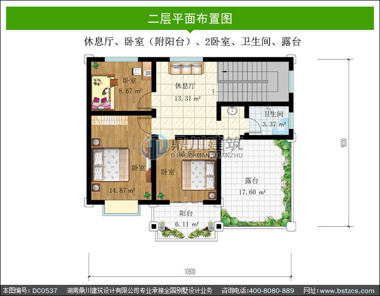 | 二 層: | 休息廳、臥室(附陽臺)、2臥室、衛生間、露臺 | |||