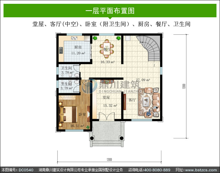 | 一 層: | 堂屋、客廳(中空)、臥室(附衛生間)、廚房、餐廳、衛生間 | |||