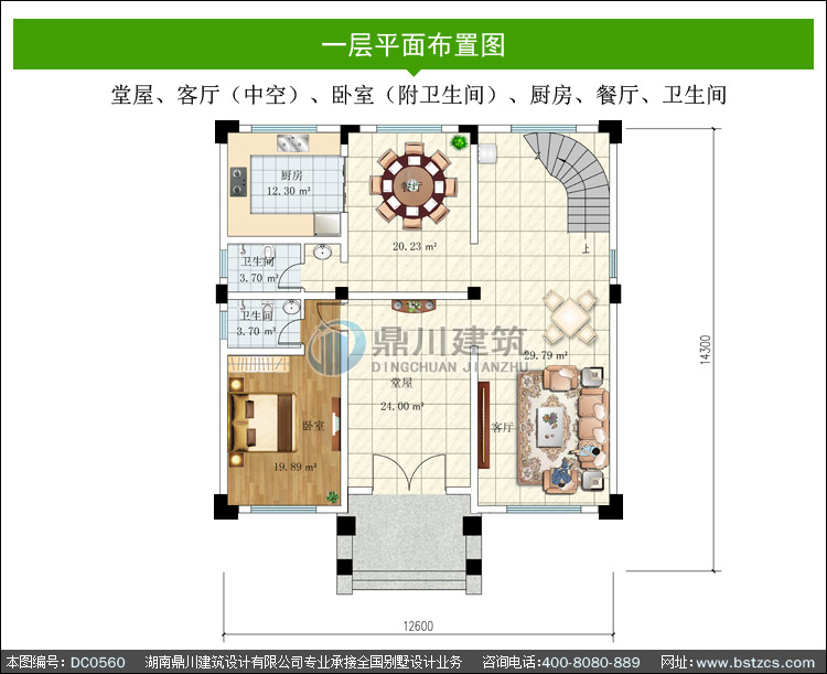 | 一 層: | 堂屋、客廳(中空)、臥室(附衛生間)、廚房、餐廳、衛生間 | |||
