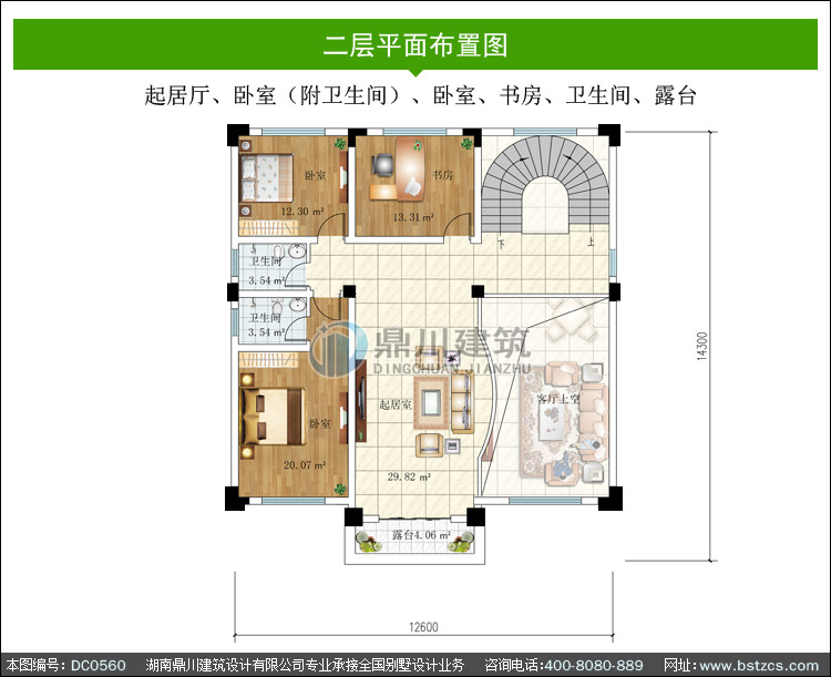 | 二 層: | 起居廳、臥室(附衛生間)、臥室、書房、衛生間、露臺 | |||