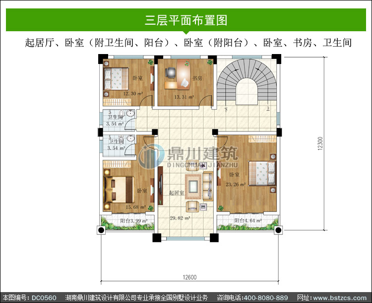 | 三 層: | 起居廳、臥室(附衛生間、陽臺)、臥室(附陽臺)、臥室、書房、衛生間 | |||