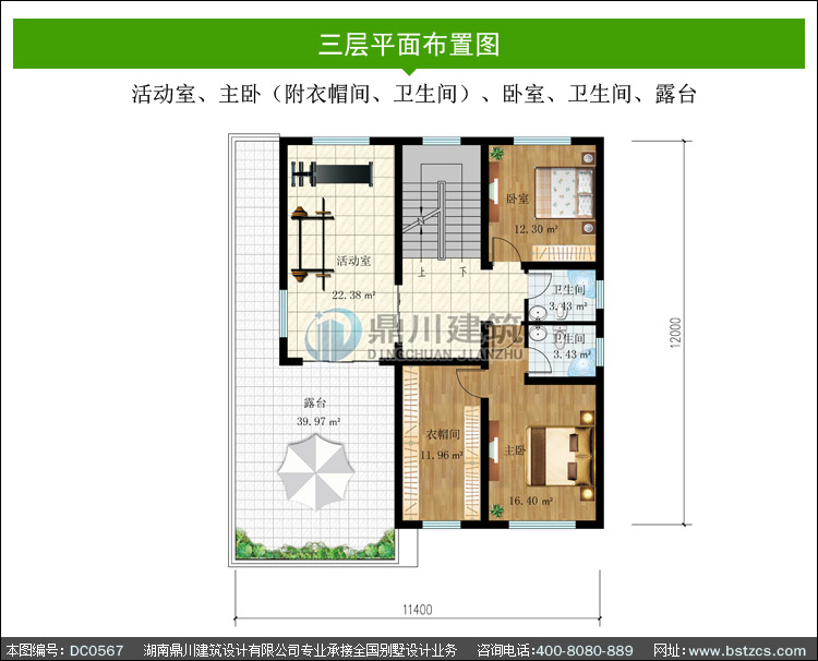 | 三 層: | 活動室、主臥(附衣帽間、衛生間)、臥室、衛生間、露臺 | |||