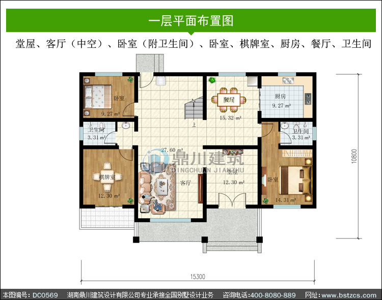 | 一 層: | 堂屋、客廳(中空)、臥室(附衛生間)、臥室、棋牌室、廚房、餐廳、衛 生間 | |||
