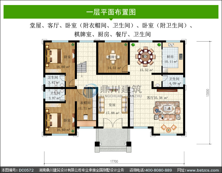 | 一 層: | 堂屋、客廳、臥室(附衣帽間、衛生間)、臥室(附衛生間)、棋牌室、廚房、餐廳、衛生間 | |||