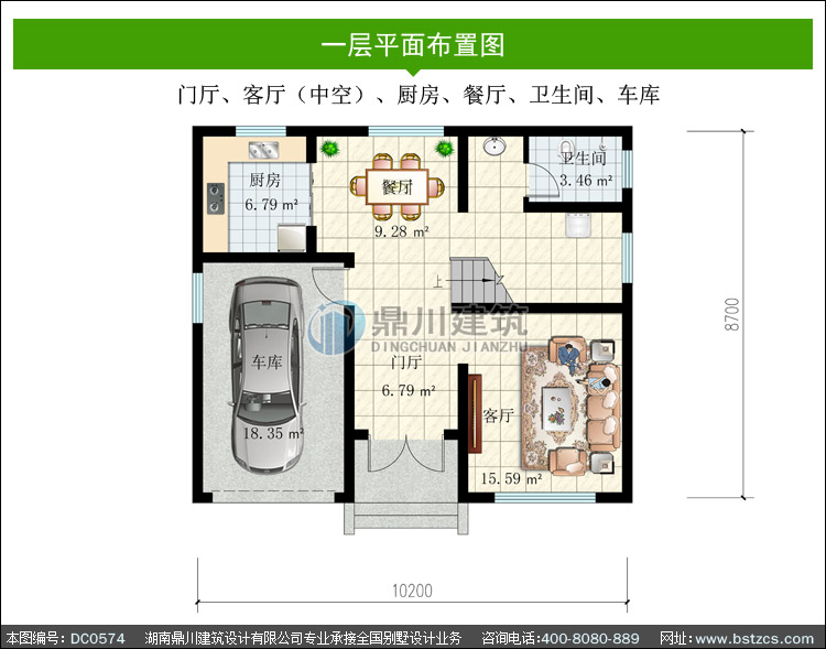 | 一 層: | 門廳、客廳(中空)、廚房、餐廳、衛生間、車庫 | |||