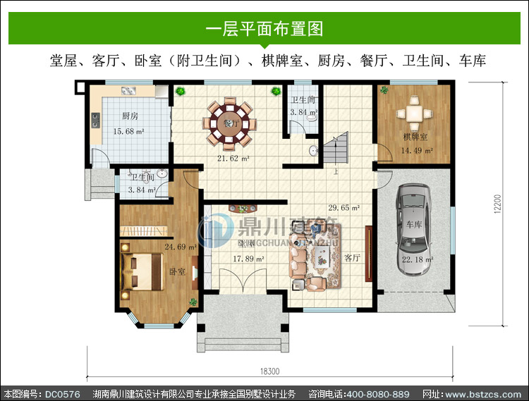 | 一 層: | 堂屋、客廳、臥室(附衛生間)、棋牌室、廚房、餐廳、衛生間、車庫 | |||